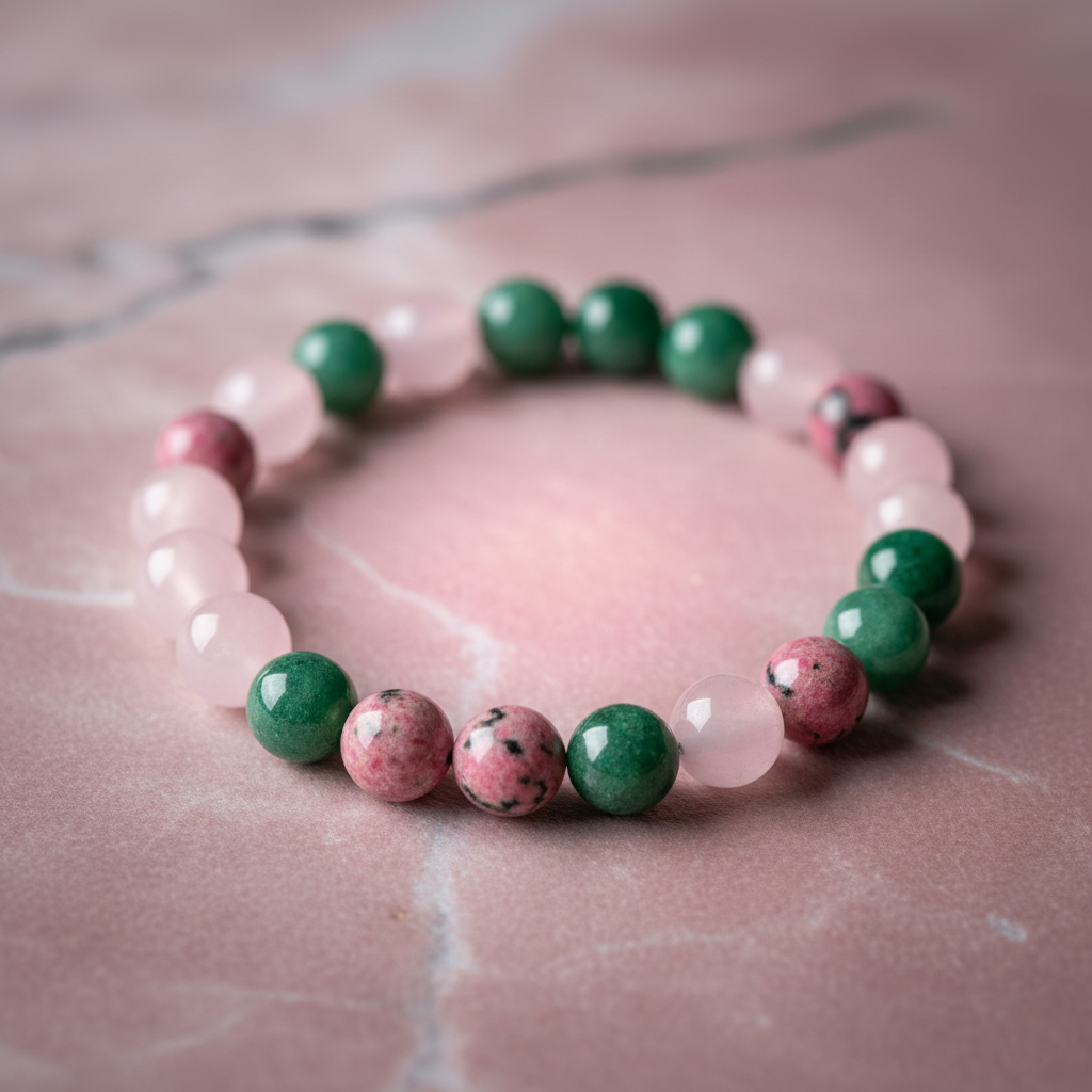 Crafted with a harmonious combination of Rhodonite, Rose Quartz, and Green Aventurine, this bracelet is astrologically associated with heart chakra balance, emotional repair, and relationship harmony.